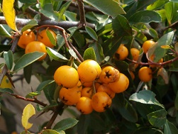 Pyracantha - A tűztövis-fajták széles szortimentje lehetőséget biztosít a választáshoz. Termésük gömbölyded csontáralma. A színsort a ’Soleil d’Or’ nyitja világossárga bogyójával (képünkön) , a ’Golden Charmer’ fajta bogyója éretten sötét sárga, a’ Navaho’, az ’Orange Glow’ és az ’Orange Charmer’ narancspiros. A ’Teton’ fajta termése szintén narancspiros, valamivel kisebb, mint az előzőeké. A ’Koralle’ fajta termése – mint neve is mutatja – korallpiros. A ’Mohave’ piros bogyói a legsötétebbek a tűztövisek között.