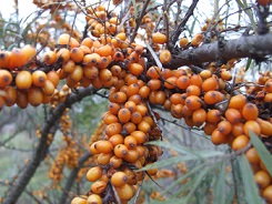Hippophaë rhamnoides – A homoktövis napjaink egyik legkeresettebb növénye. A növény kétlaki, ezért külön termős és porzós példányokra van szükségünk. Termést csak a nőivarú példány hoz. Mivel a termések a több éves hajtásokon jelennek meg, metszésükkor ezt vegyük figyelembe.